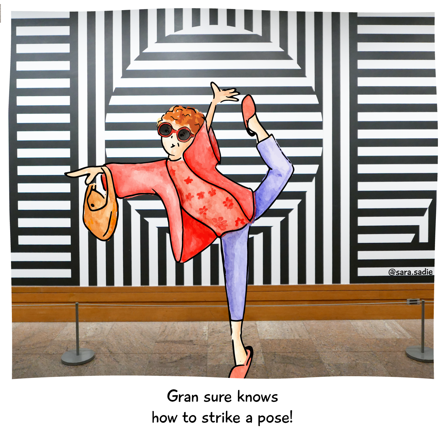 An industrial designer and artist, Kate was inspired to create the characters of Sara Sadie and Gran based on her relationship with her own grandmother (who happens to live just a few blocks away from Kate here in NYC). Each of her drawings are hand-painted, scanned then digitized on photos Kate takes around the city. And what adventures they have together! Why Sara Sadie has even had tea with Millie before (see last photo)...